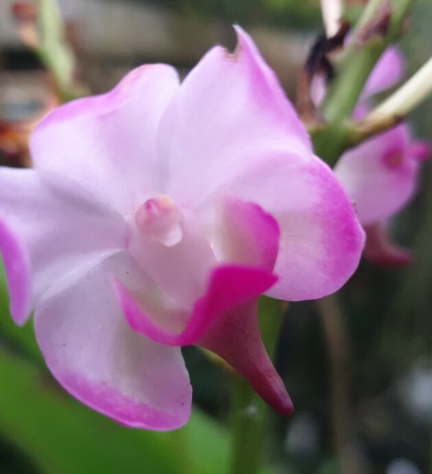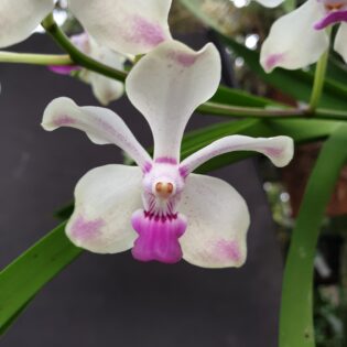 Aerides lawrenceae x Vasco Blue Fairy is a beautiful intergeneric hybrid although not blue it is white with a pink overlay and a deep pink lip .