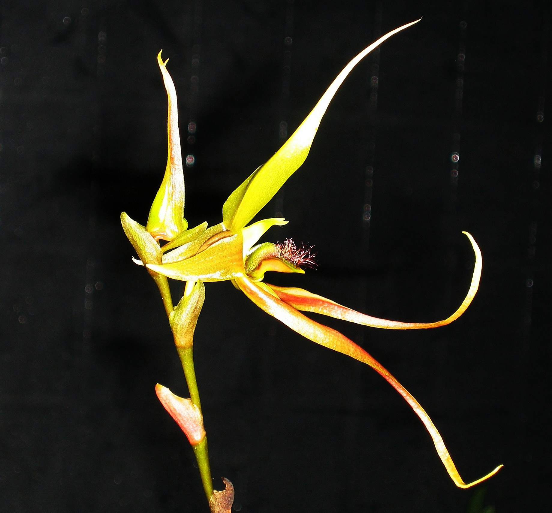 Bulbophyllum sulawesii is a weird and wonderful large growing Bulbophyllum species with large yellow and burnt orange flowers with a hairy lip. The flowers are held up on a strong tall spike above the foliage.