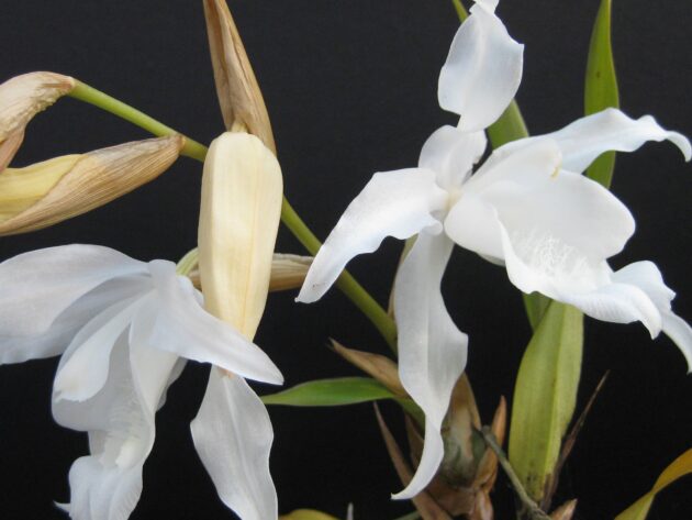 Coelogyne cristata variation hololeuca is a stunning Himalayan species with pristine white flowers displayed on arching flower spikes and grows into a beautiful specimen when grown in a basket. Flowering size plant of Coelogyne cristata var hololeuca for sale $40
