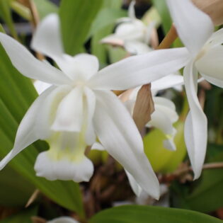 Coelogyne marmorata is a stunning species from the Philippines with slim arching flower spikes, each spike carrying 3-5 beautiful apple green flowers with red marbling on the inner lobes of a white lip. Fragrant.