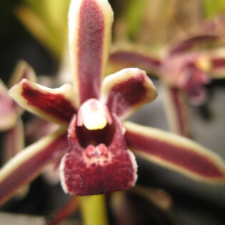 Cymbidium bicolor is a strong growing species with long arching flower spikes carrying up to 26 fragrant flowers, cream with red markings on all segments.