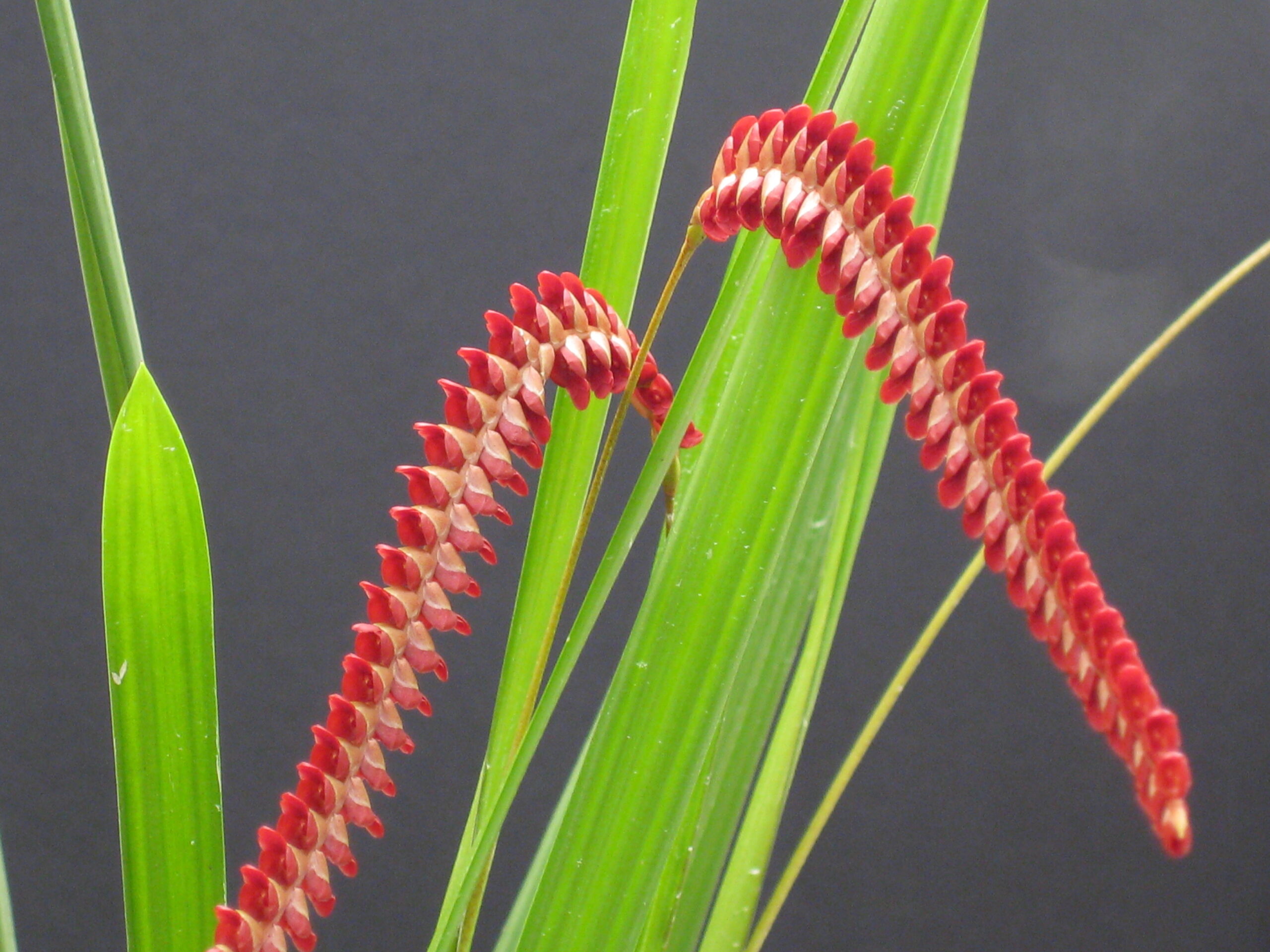 Dendrochilum saccolabium is a rare species from the Philippines. Semi-arching sprays of deep red flowers, up to 40 per spike, that appear with the new growth.