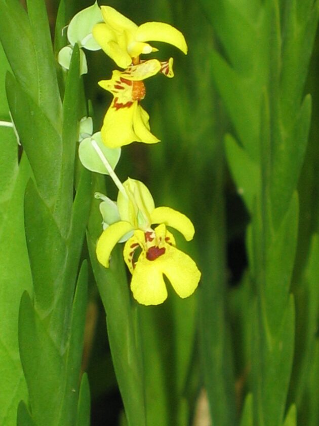 Lockhartia oestedii is an unusual Central American species with stunning braided looking foliage. Bright yellow and red flowers are carried on short pendulous stems with up to 3 flowers per stem. Flowering size plants of Lockhartia oestedii for sale $30 each.