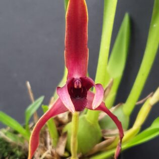 Strong dark red coloured flower, white lip with red spots.
