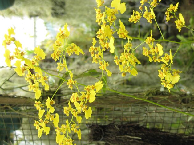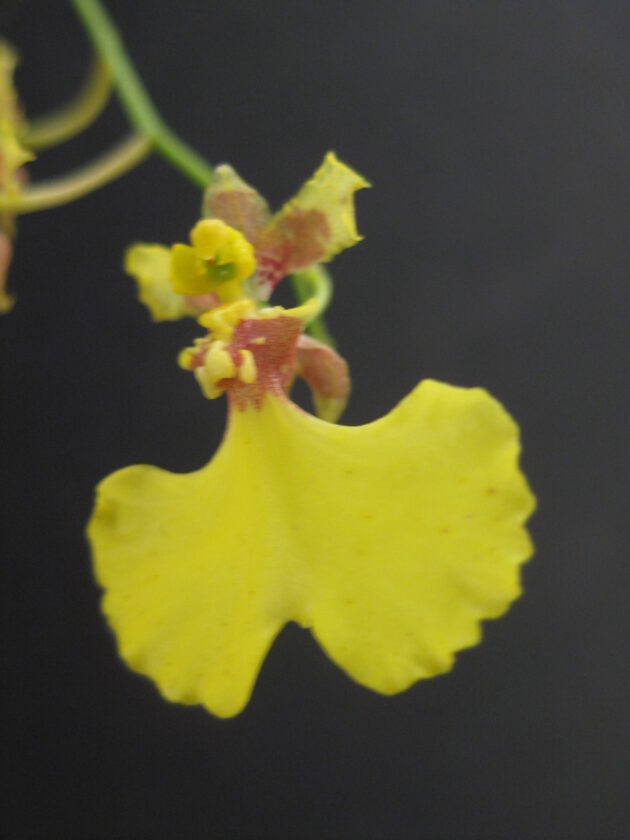 Lovely easy to grow Brazilian species with an abundance of delicate bright yellow flowers with some red markings carried on long fine stems. Grows well mounted or in pots.