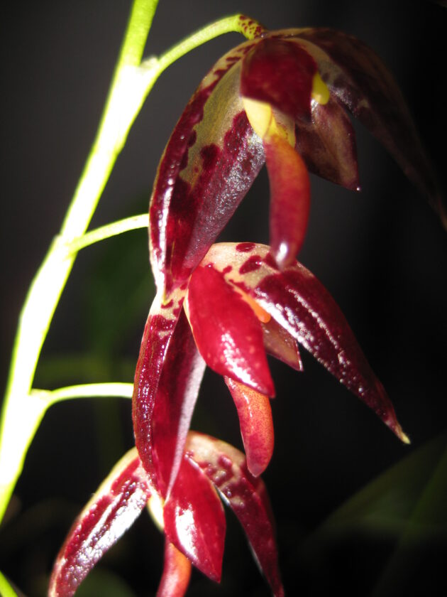 New. Pleurothallis restrepioides is a medium sized growing species from Colombia, Ecuador and Peru. Glossy maroon flowers with dark purple spotting are held on upright spikes. Flowering size plant of Pleurothallis restrepioides for sale $30