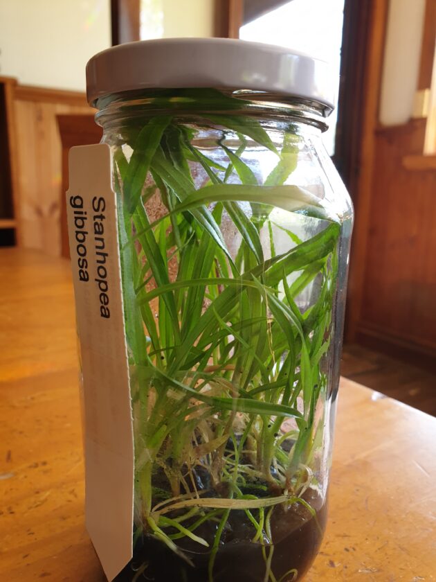 Stanhopea gibbosa is a stunning, very rare species, seldom seen in cultivation with clusters of large, creamy white flowers with masses of distinctive red purple outlined spots.
