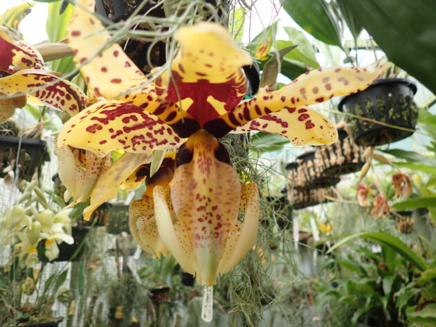 Stanhopea nigroviolacea x tigrina is a hardy, easy to grow Stanhopea hybrid with a strong vanilla fragrance and very large cream yellow flowers with bold red markings. Near flowering size plant of Stanhopea nigroviolacea x tigrina for sale $50